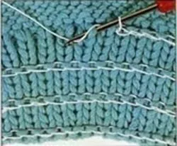 У резинки 1 х 1 проложите нить с изнаночной стороны с равными промежутками через половинки всех петель. Привяжите нить к кромочной петле или прикрепите ко шву.