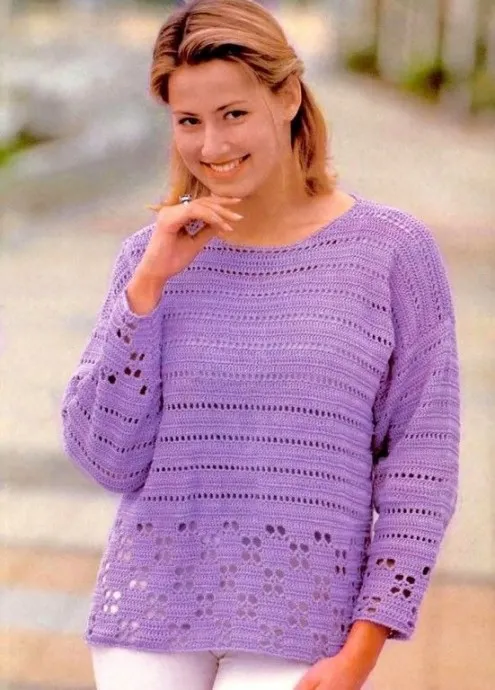 Джемпер прямого покроя, из хлопковой пряжи нежного сиреневого цвета, связанный узором с «дырчатыми» узкими полосами и широкой ажурной каймой – именно то, что нужно теплой летней погоды
