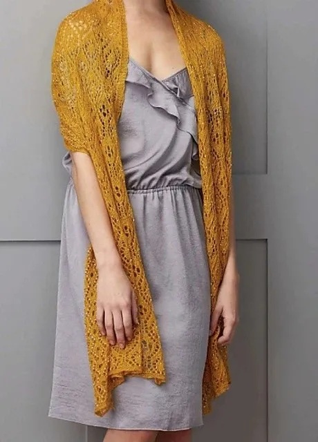 Палантин спицами ажурным узором, украшенный бусинами