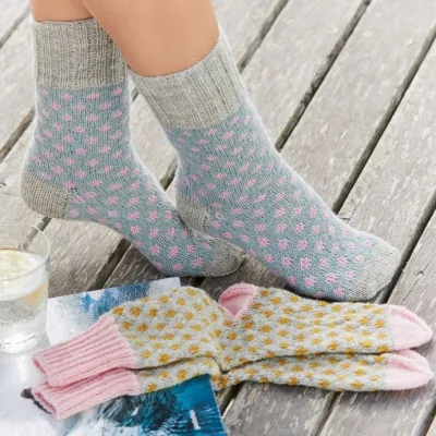 для носков в розовый горошек: пряжа (80% овечьей шерсти, 20% полиамида; 210 м/50 г) — по 50 г светло-серой и светло-голубой;