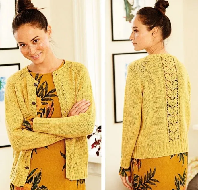 Gряжа (55% шерсти, 45% хлопка; 50 г/112 м) — 7 (8) 9 (9) мотков желтой; круговые спицы №4 и 5 длиной 80 см; чулочные спицы №4 и 5 или 8 маркеров петель; 6 пуговиц диаметром 18 мм.