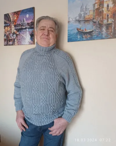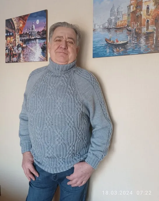 Замечательный свитер!!! Красивый рисунок! Великолепная посадка на фигуру! В этом свитере муж стройняшка! Вы мой Герой — закрыть такие области иглой — подвиг для меня!!!