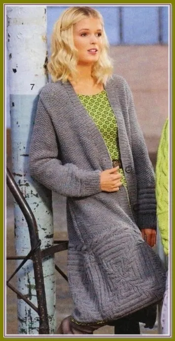 Выполнить плечевые швы. На круговые спицы набрать по прямым краям полочек по 122 п., скосам выреза по 57 п., вырезу горловины спинки 35 п. и вязать на всех 393 п. резинкой планку. Через 1,5 см выполнить на правой планке 4 отверстия для пуговиц: закрыть 2 п. и в следующем ряду их снова набрать. Выполнить 1-е отверстие через 36 п. от нижнего края, следующие отверстия выполнить с интервалом 24 п. На высоте планки 4 см все петли закрыть по рисунку. Втачать рукава, выполнить боковые швы и швы рукавов. Пришить пуговицы.