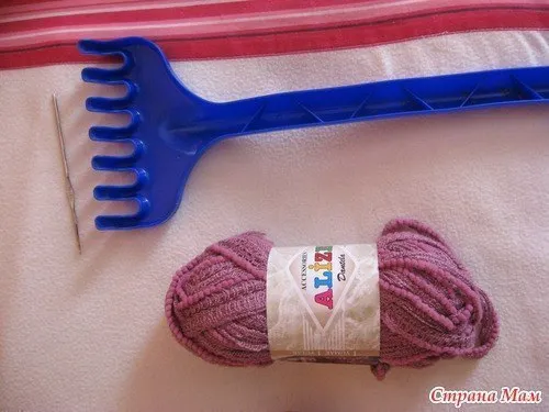 Из всего что нам пригодится это сама пряжа, грабли (любые, в моем случае детские, прошу прощения за не совсем чистые они у детей в постоянном использовании, еле урвала что бы сделать МК) и обычный крючок, размер любой