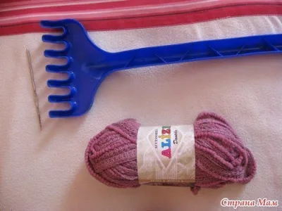 Начало такое: через каждую одну дырочку мы надеваем пряжу на зубцы грабли