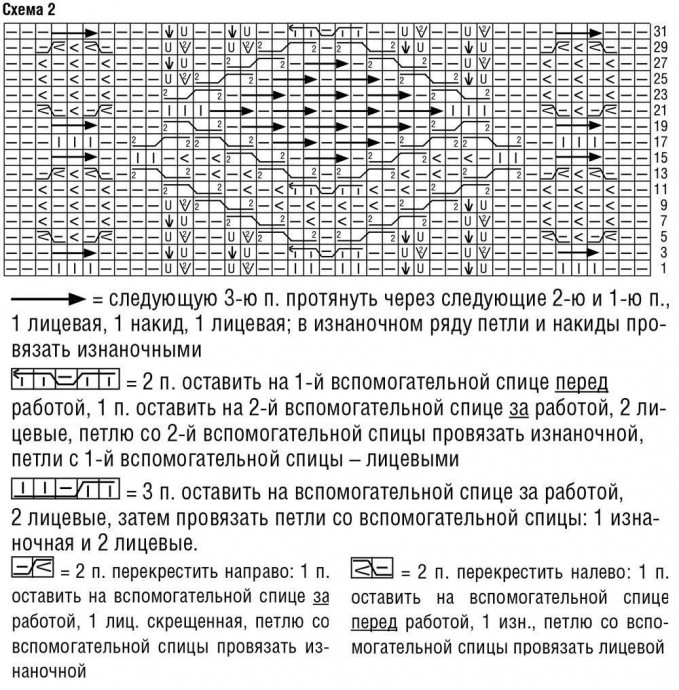 Вязать по схеме 2. На схеме даны лицевые ряды, в изнаночных рядах петли провязывать по рисунку, накиды — изнаночными. На приведенных петлях в ширину вязать 1 раз. В высоту повторять с 1-го по 32-й.