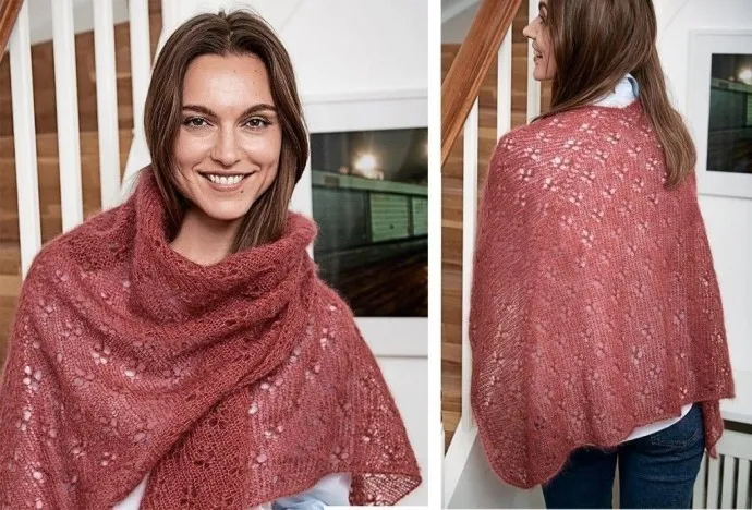 Благодаря прибавкам, сделанным согласно описанию, эта шаль с несложным ажурным узором прекрасно лежит на плечах.