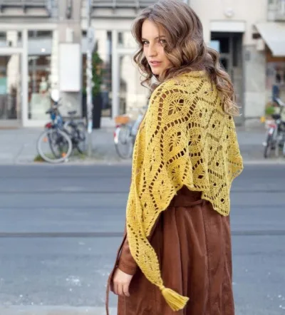 Ажурную шаль, связанную из мягкой и теплой пряжи из смеси альпаки и шелка, можно носить как головной убор или накинуть на плечи.