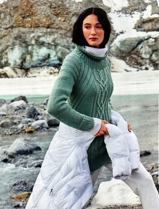 500 (550) 600 г мятно-зеленой пряжи (70% шерсти, 30% шерсти альпака; 90 м/50 г); спицы № 5,5; круговые спицы № 5,5.