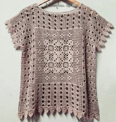 Бежевый топ с оригинальным сочетанием филейки и квадратных мотивов от японских дизайнеров