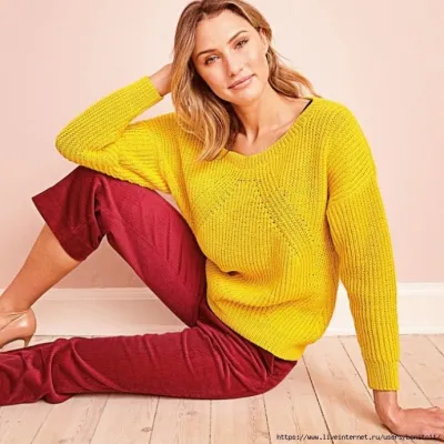 Желтый джемпер с рельефной отделкой полупатентным узором спицами