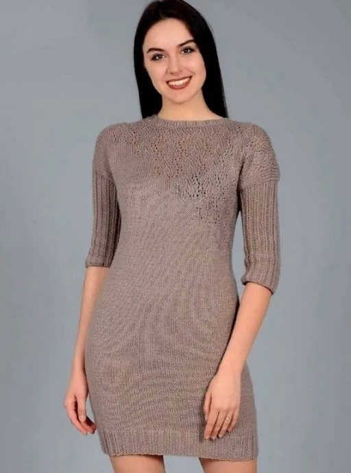 700-800 г пряжи бежевого цвета (50 % шерсть, 50 % акрил, 280 м/100 г), прямые и круговые спицы № 4.
