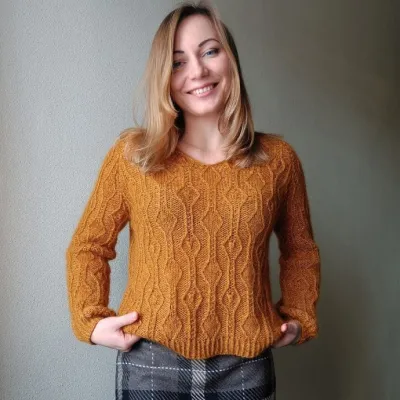Вязала регланом сверху. V-образная горловина. Без ростка. Расчетная ширина корпуса 54 см.