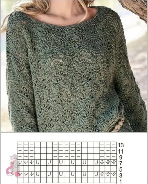Ажурный узор: количество петель кратно 17. Вязать по приведенной схеме. На ней даны лиц. р. В изн. р. петли и накиды провязывать изнаночными. В ширину повторять раппорт между стрелками. В высоту выполнить 1 раз с 1-го по 14-й р., затем повторять с 3-го по 14-й р.