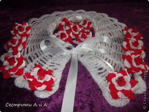 Обвязала горловину столбиками с накидом, такими арочками . И вставила белоснежную ленточку , которая как нельзя лучше подходит к белоснежной пряже .