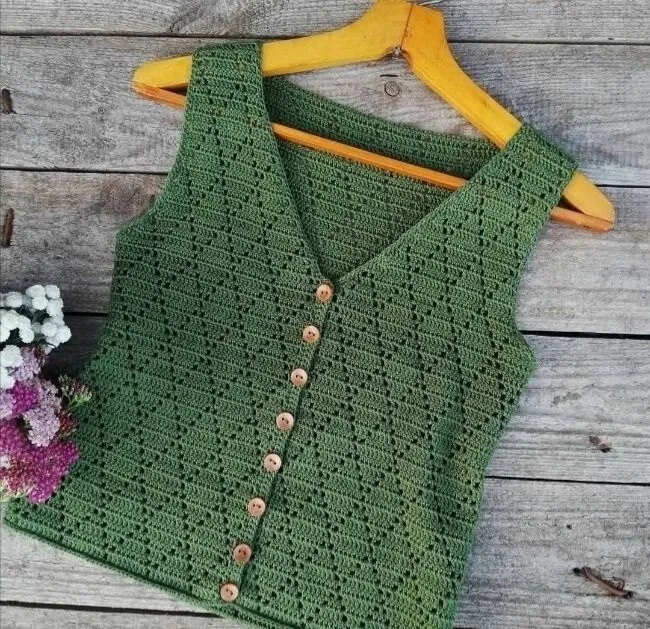 Когда закончите все убавления и довяжете до конца, сшейте плечевые швы и обвяжите весь топ столбиками без накида.