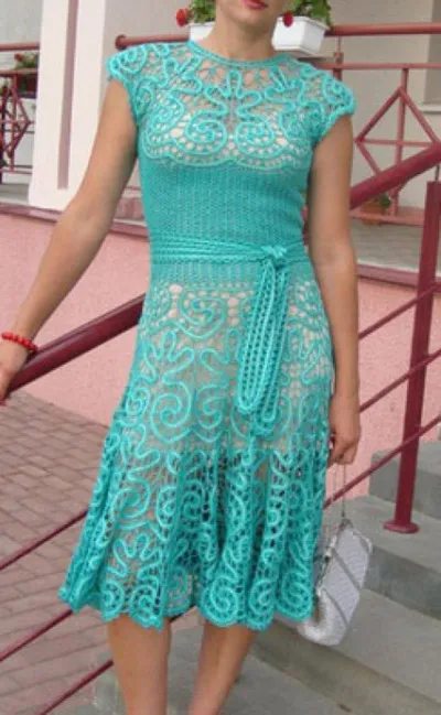 К прямой тесьме присоединяйте ленты (7 полос), которые вяжутся по схеме 14 а, располагая фестоны в шахматном порядке. Регулируйте размеры (расширение) юбки при помощи увеличения накидов в фестонах, а также после выполнения первых трех полос поменяйте крючок с 0,7 на 1 мм.