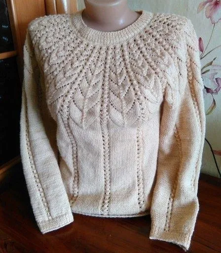 Нитка Лана Голд 800 метров, вязала в две нитки, спицы№ 2 Вязался свитер очень легко. Вязала в две нитки. Ушло три мотка По кругу набрала 144 петли получилось 18 листиков по 5 на перед и спинку и по 4 на рукава.