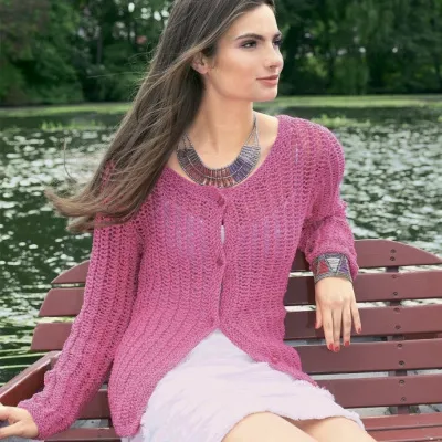 Несложная в работе и практичная в носке кофта с широким вырезом горловины прекрасно подойдет для лета.