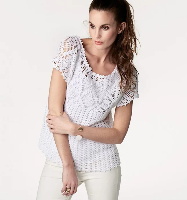 Классические нестареющие «Ананасы» украшают кокетку этого женственного и нежного ажурного топа.