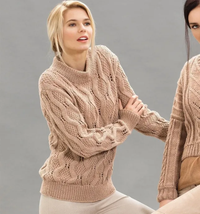 Пряжа (75% шерсти, 25% нейлона; 133 м/50 г) — 500 г песочной; спицы №5 и 5,5; круговые спицы №5.