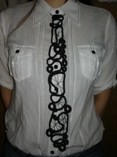 Моя младшенькая захотела украшение к блузке типа галстука. Вот что получилось. Ниточка была без этикетки, шелковистая, очень скользкая. Второй раз из этой ниточки вязать не рискну.