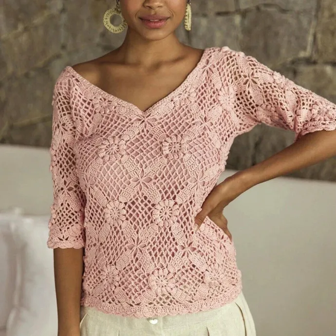 Интересный цветочный мотив из пышных столбиков и воздушных цепочек. Мотивы имеют квадратную форму, но за счёт воздушных цепочек соединение практически незаметно и узор кажется единым полотном. Для вывязывания V-образного выреза на схеме приведён вариант половинки мотива.