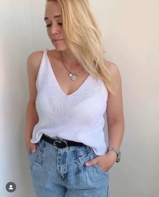 Красивый летний топ с перекручеными лямками, вяжем спицами