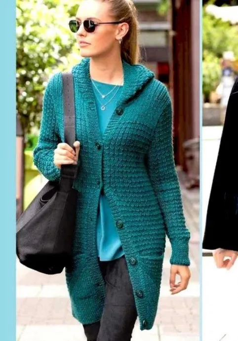 Приметные детали удлиненного жакета - накладные карманы и модный капюшон. Разнообразия вязаному полотну добавляют структурные и рельефные узоры.