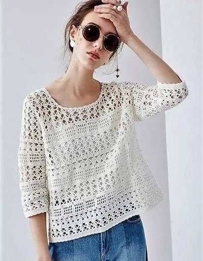 1. Легкость и воздушность: Белый цвет всегда ассоциируется с чистотой и свежестью. Ажурный узор, выполненный крючком, придает изделию легкость и воздушность, что делает его идеальным для жарких летних дней. Такой джемпер позволяет коже дышать, создавая комфорт даже в самую знойную погоду.