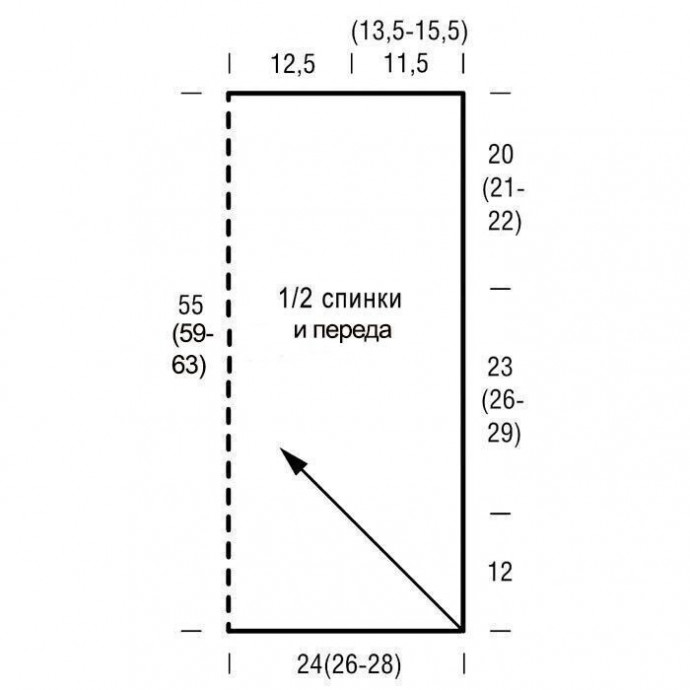Для правого нижнего угла набрать 3 п. и вязать изнаночной платочной вязкой по косой с выделенными прибавлениями с узелковыми краями, начиная с изнаночного ряда, как обозначено. Через 55 (59) 63 см (измеряя вертикально от правого нижнего до верхнего угла, не по направлению вязания) = 147 (159) 171 р. от начального ряда (на спице 147 (159) 171 п.) будет достигнута с правого края высота плеча, с левого края – левый нижний угол спинки.