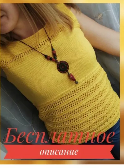 Желтый женский топ с ажурными дорожками, связанный спицами
