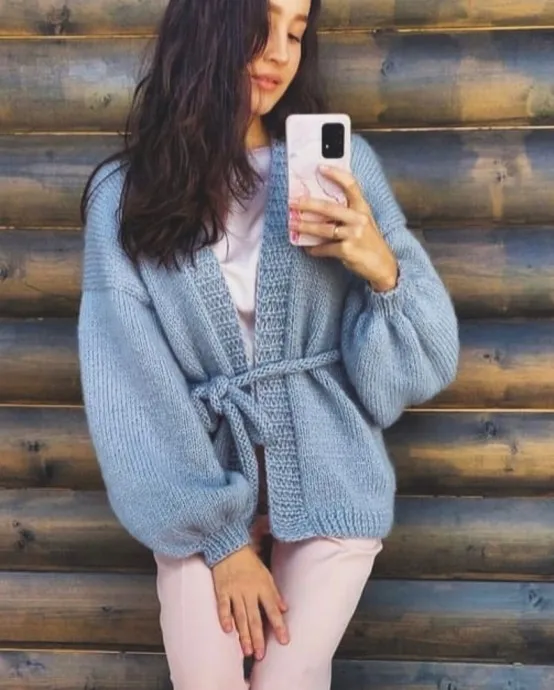 Оригинал пряжи: Alize Angora 40 real, 400 м/100 гр, расход от 450 гр. в зависимости от длины кардигана. Подойдет любая пушиствя пряжа длиной примерно 200м/100 гр.