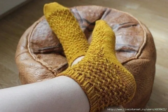 Ажурные носочки от дизайнера Clare Devine выполнены из пряжи солнечного оттенка, они имеют французский мысок и пятку, сформированную укороченными рядами. Все вместе напоминает спелый ананас и выглядит весьма жизнерадостно.