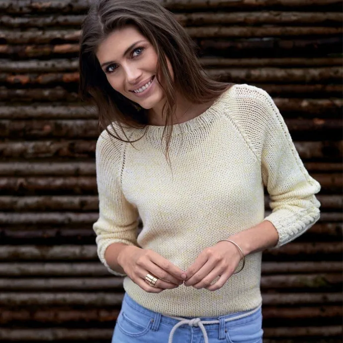 пряжа 2 (45 % шелка, 55% шерсти; 50 г/300 м) — 2 (3) 3 (3) мотка бледно-желтой; круговые спицы №6 и 7 длиной 60 и 80 см; чулочные спицы №6 и 7 (или круговые спицы длиной 40 см).