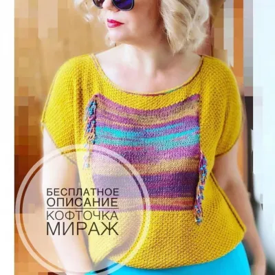 Вяжите так же, как и перед, только вырез горловины закрываете на высоте 55 см.