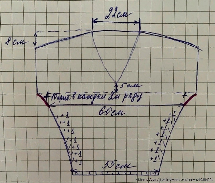 У меня при ОГ 97см ширина футболки 60 см до момента начала прибавок формирования рукава (см рисунок). Т.е. у меня было в каждом 10 ряду прибавлено 7 раз. Т.е прибавка 28 петель по кругу составила, что при моей плотности составляет 10 см.