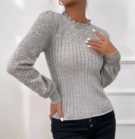 Чудесный джемпер, основная часть которого выполнена резинкой, если я правильно посчитала, 5 х 1 (5 лиц., 1 изн.). Кокетка и рукава украшены ажурным узором, понять и просчитать который вполне можно по увеличенному фото ниже