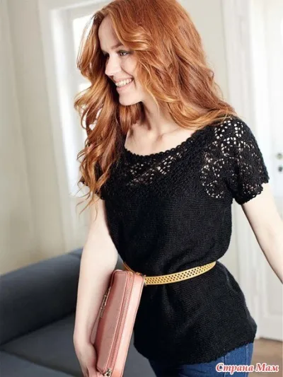 Пряжа (58% льна, 16% хлопка, 26% вискозы; 50 г/150 м) – 6 (6) 6 (7) мотков черной; круговые спицы № 3,5 длиной 80 см; крючок № 2,5 и № 3.