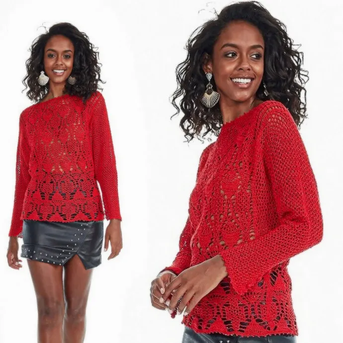 Красный сетчатый джемпер, связанный крючком, — это стильный и универсальный элемент гардероба, который позволяет создавать множество интересных и запоминающихся образов. Сочетайте его с разными вещами и наслаждайтесь своим ярким и уникальным стилем!