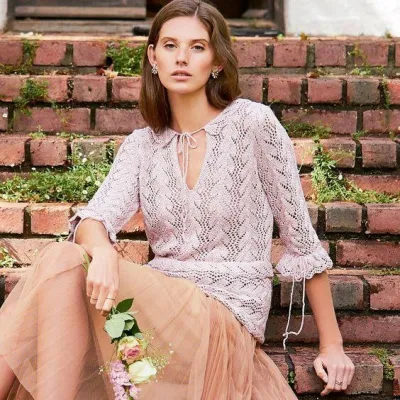 Нежный розовый пуловер на завязках спицами. Ажурный шелковый пуловер напоминает блузку в стиле фолк. Многочисленные изысканные детали, такие как круглый «детский воротничок», воланы, фестончатые нижние края и завязки, подчеркивают женственность этой модели. Широкая нижняя часть типа баски вяжется поперек и пришивается к готовому лифу.