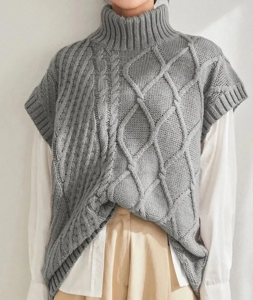 В этой модели есть "изюминка" - асимметричное расположение узоров. Правая часть безрукавки - крупные ромбы. Слева вывязаны жгуты и две разные "плетенки". Мне очень нравится эта модель.