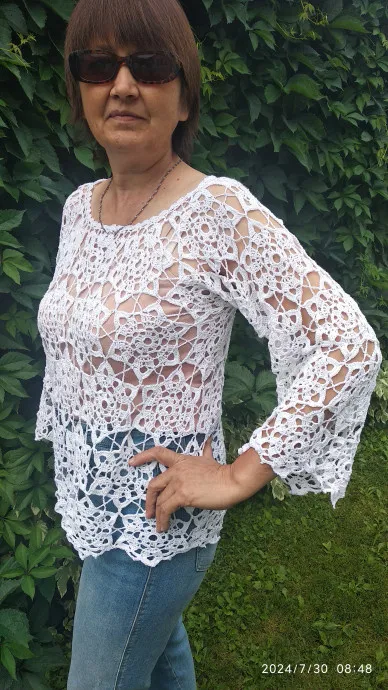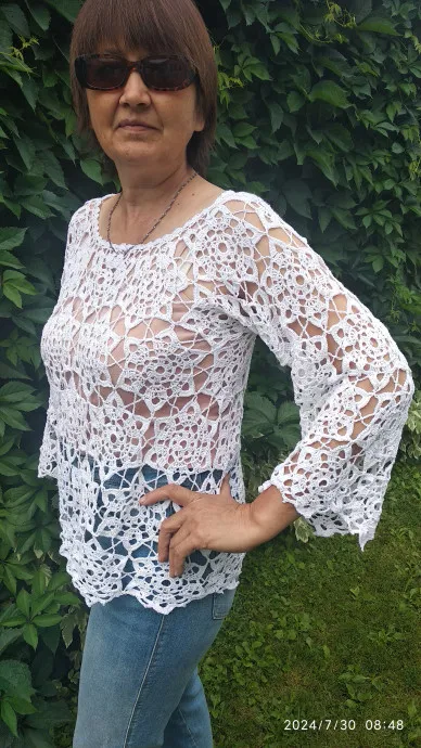 Вязала из бобинной белорусской пряжи, хлопок. В 500 но 2800 метро, крючок номер 2. Ушло 2000 метров нити. Размер на 50-й. Вязала в одну нить