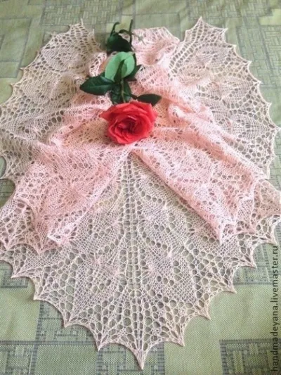 Спрятать концы нитей, отрезать после растяжки. Намочить шаль в воде с добавлением моющего средства минут на 20.