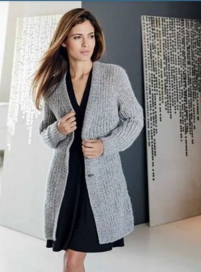Вам потребуется: 550 (600) г серой меланжевой (цв. 5) пряжи Gаrzаtо Finе (40% альпака, 20% мохера, 20% мериносовой шерсти, 20% полиамида, 150 м/50 г) Lаnа Grоssа; спицы № 5, № 7 и № 8; круговые спицы № 5; 3 пуговицы.