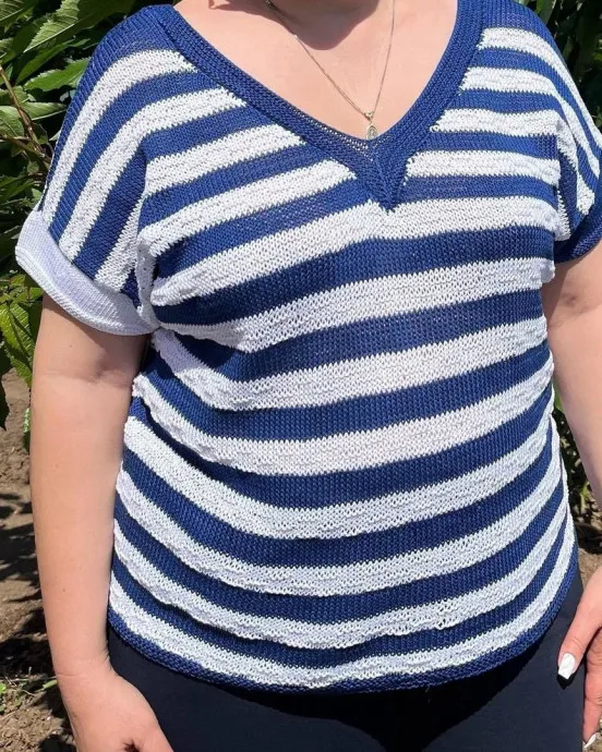 Набираем петли по вырезу горловины и так же обвязываем по кругу 14-16 р платочкой. При этом центральные петли переда и спинки провязываем 3 п вместе ( т.е.центральная петля и боковые петли провязывая в каждом р 3 вместе лиц.