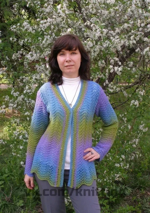 Набрать на спицы 3,5 189 петель (11 раппортов узора = 187 петель +2 кромочные) и вязать основным узором 10 см (можно от 2-х клубков, с одного цвета, чтоб цветовая полоса была шире), затем поменять спицы на №3, провязать 8 см. Затем поменять спицы на №2,5 и провязать 4 см. Затем снова меняем спицы на №3 и вяжем до проймы (от низа жакета - 40 см). Затем полотно делится на 3 части: 47 петель, 95 петель и 47 петель.