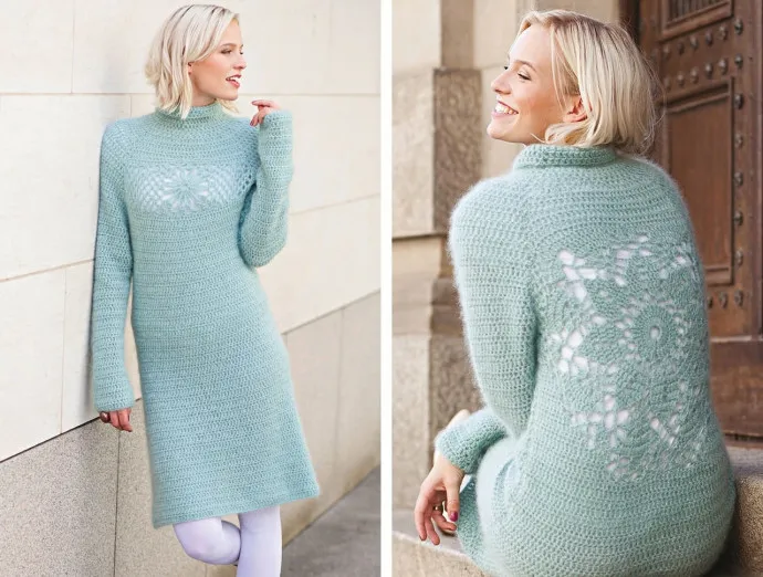 Пряжа (72% мохера, 21% нейлона, 7% полиэстера; 127 м/25 г) — 450 (500) г нежно-голубой; крючок №5.