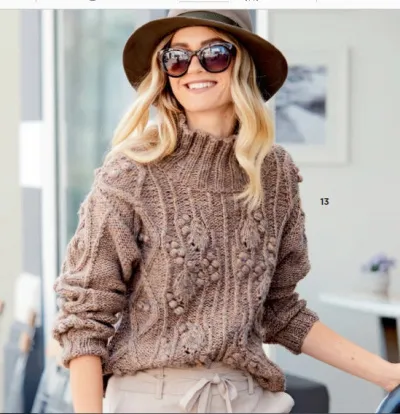 Красивый свитер с воротом стойкой связан спицами замысловатыми аранами и «шишечками» словно вьющийся виноград из объемной легкой пряжи с шерстью.