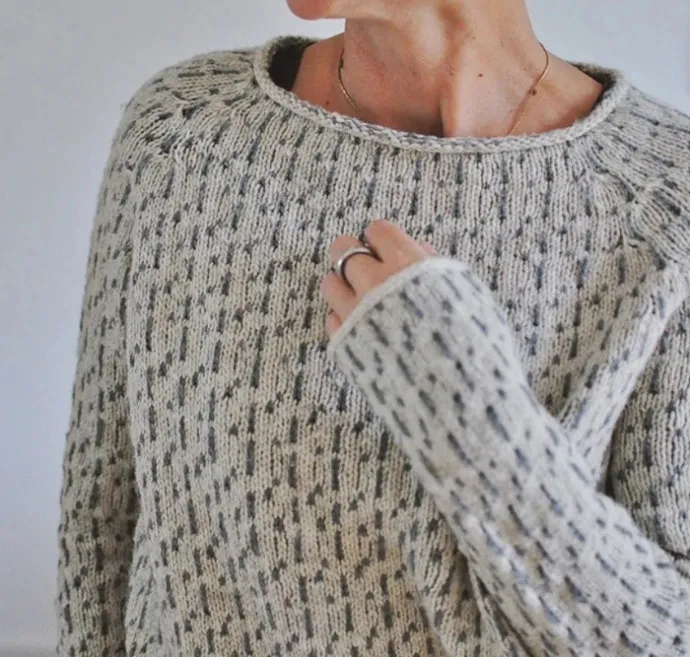 Пуловер SYDVESTER вяжется без швов сверху вниз жаккардовым мотивом со снятыми петлями. В начале вязания выполняется формирование горловины, затем продолжается вязание с прибавлениями по линиям реглана до момента разделения на туловище и рукава. Затем петли рукавов откладываются на бросовую нить, поднимаются петли для пройм, и вы продолжаете вязать туловище вниз до кромки. После того, как вязание туловища будет завершено, петли рукавов возвращаются на спицы и вяжутся рукава круговыми рядами вниз до манжет.
